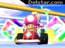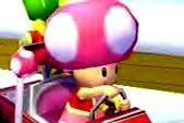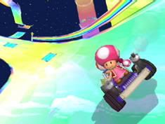 toadettepic4.jpg: Toadette hanging on the back of the Toad Kart in MK:DD course Rainbow